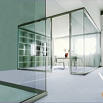 В цельностеклянные перегородки можно установить различные тип дверей. В частности используется маятниковые двери без обрамления и коробки, а так же можно использовать распашные двери и откатные двери.